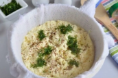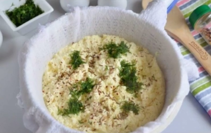 Po dvou minutách si vezměte k ruce cedník a přikryjte ho gázou. Přes ni mléko s kefírem přelijte a zadrženou hmotu vložte do mísy. Ochuťte ji v další fázi jemně nasekanými bylinkami, vsypte i koření, lisovaný česnek, osolte a dobře promíchejte.
