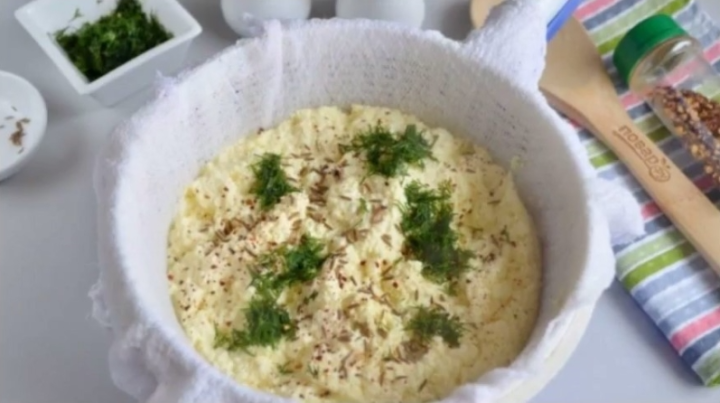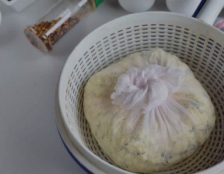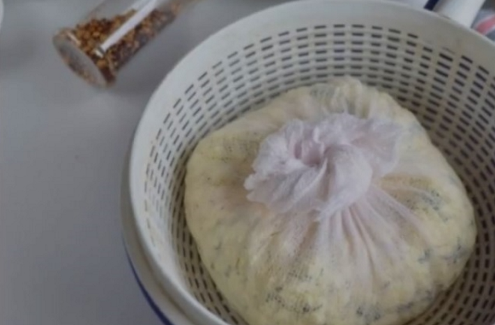 Nakonec kořeněný sýr zavažte pevně do čisté gázy, aby odtekla zbylá tekutina a hmota se vytvarovala. Abyste podpořili odstranění vody, můžete na sýr položit i těžší předmět nebo hrnec s vodou.