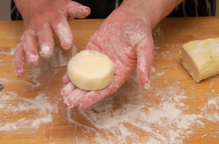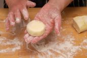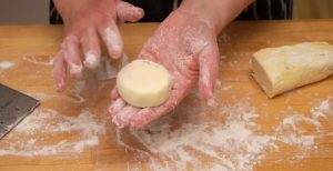 Na pracovní plochu nasypejte trochu mouky a těsto na ni přemístěte. Rukama z něj vytvořte válec a nachystejte si nůž. Odkrojte z něj první kousek o šířce cca 2,5 cm a ze všech stran jej uhlaďte do tvaru menšího bochánku. Poté z něj omeťte přebytečnou mouku a odložte bokem na zlehka pomoučený pečicí papír. Abyste odkrojili druhý kus, tak těsto otočte o 90 stupňů a takto opakujte, dokud vám nedojde.