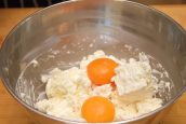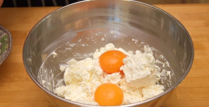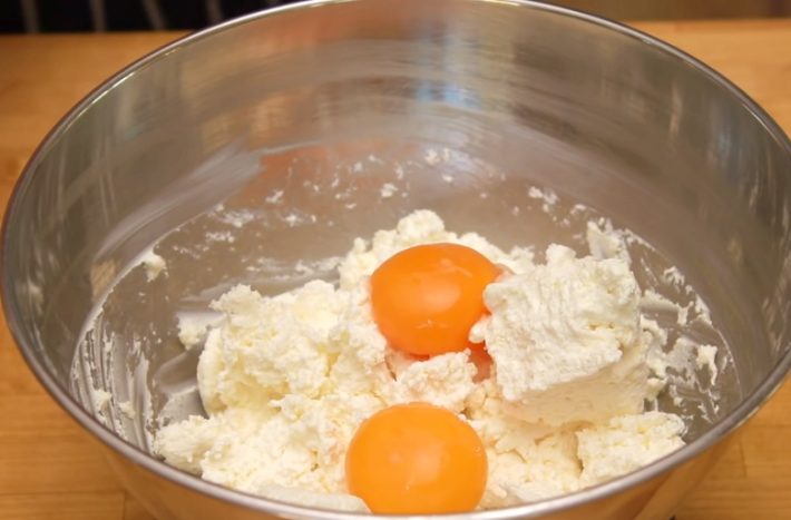 Nachystejte si tvaroh. Vložte jej do větší mísy a postavte ji na váhu. Rozklepněte dvě vejce a oddělte žloutky od bílků. Žloutky přidejte k tvarohu. Bílky rozšlehejte vidličkou a dodejte jich takové množství, aby spolu se žloutky vážily 50 g (viz video). Přisypejte cukr se solí, vanilkovým extraktem a důkladně promíchejte s pomocí šťouchadla na brambory, nešlehejte mixérem.