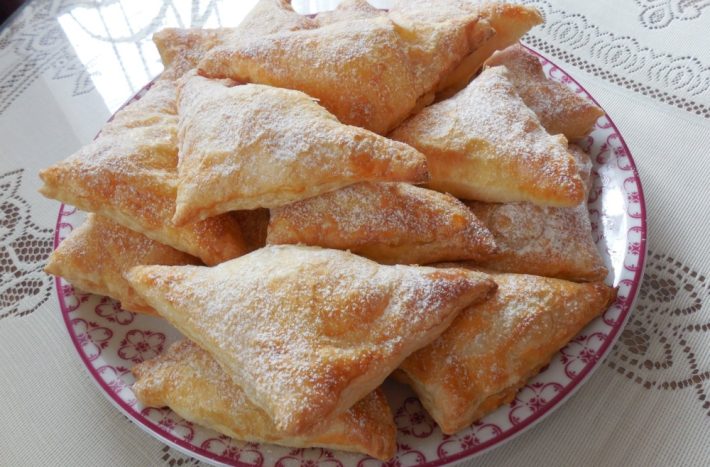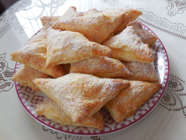Těsto na vále vyválejte na tenkou placku a nakrájejte ji na čtverce, rozměr přizpůsobte tomu, jak velké chcete šátečky mít. Doprostřed každého čtverce dejte trochu náplně, přeložte ho na trojúhelník a spoje těsta dobře přimáčkněte.