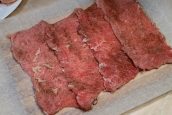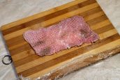Připravte si velký plát pečicího papíru, na který umístěte kořeněné plátky masa tak, aby se vzájemně asi centimetr překrývaly. Oloupejte stroužky česneku, prolisujte je a pastou natřete celý povrch masových plátů. Nakonec je posypejte ještě hořčičnými semínky.