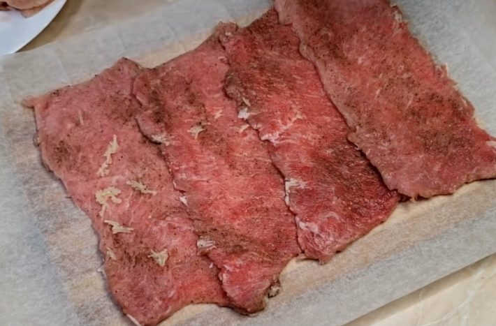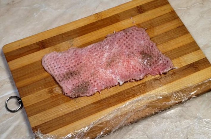Vepřové maso omyjte a osušte papírovou utěrkou. Ostrým nožem ho nakrájejte na tenké plátky, zakryjte ho potravinářskou fólií či igelitovým sáčkem a z obou stran ho rozklepejte do tenkých plátů. Ty pak z obou stran osolte a opepřete podle chuti, případně můžete použít i další své oblíbené koření, které rukama důkladně zatlačte do povrchu masa a nechte ho 30 minut odpočívat v lednici.