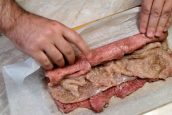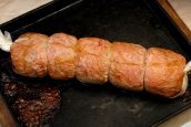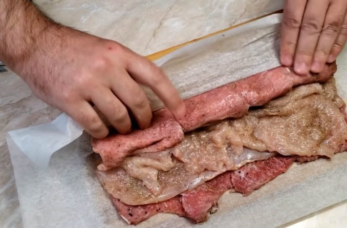 Kuřecí maso omyjte a osušte a stejně jako vepřové jej paličkou jemně naklepejte. Položte pláty kuřete na plát vepřového a posypejte solí a pepřem. Poté s pomocí pečicího papíru pláty masa stočte do tenké roličky a zabalte ji do papíru, kterým jste ji rolovali. Nakonec pevným provázkem zavažte oba konce rolády a v pravidelných intervalech ji převažte i po celé její délce.