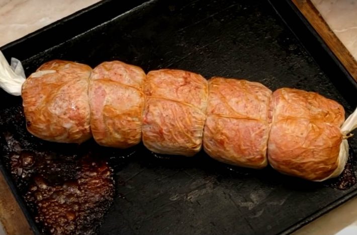Nakonec můžete roládu rozbalit z papíru, nakrájejte na plátky o síle kolem jednoho centimetru a podávejte doplněnou o bramborovou kaši a nakládanou zeleninu nebo s jinou svou oblíbenou oblohou.