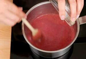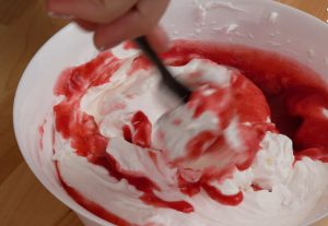 Když je jahodové pyré chladnější a začíná tuhnout, je čas na zjemnění smetanou. Ta se nejprve vyšlehá do podoby šlehačky, která by si však měla zachovat stále určitou tekutost. Poté se ručně opatrně přimíchá jahodový základ a krém pro tento dort je hotový.