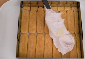 Místo klasického těsta se do formy vyskládají cukrářské piškoty namáčené v mléce. Měly by zabírat celou spodní plochu. Následně se na připravenou vrstvu nanese krém. A to veškerý. Rozetře se až do stran tak, aby byl ve všech místech stejnoměrně vysoký. Takto připravený rozpracovaný základ se vloží tuhnout do lednice.
