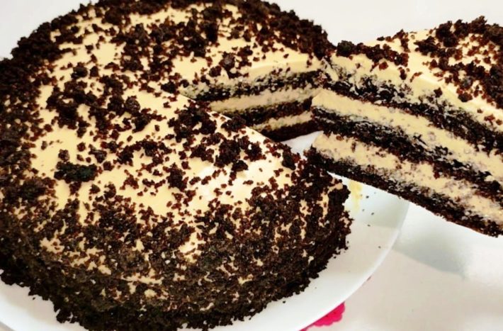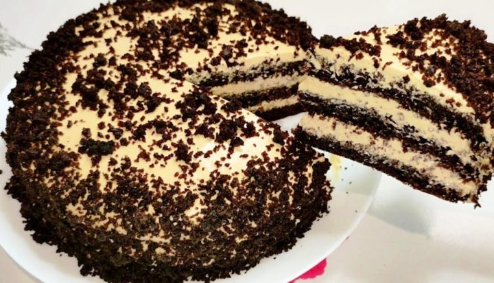 Poté formu vytáhněte a nechte korpus vychladnout. Následně jej podélně rozkrojte na tři pláty. Z vrchního odřežte zaoblenou část a rozmixujte ji nadrobno. Na krém dejte smetanu do mísy a postupně k ní zašlehávejte vařené kondenzované mléko. Směs vyšlehejte dohladka. Následně sestavte dort, krémem potřete i jeho vrch a boky a ozdobte ho rozdrobeným těstem. Poté jej dejte vychladit do lednice a můžete podávat, dobrou chuť!