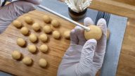 Jakmile vznikne drobenková směs, zapracujte do ní změklé máslo a uhněťte hladké tuhé těsto, z kterého vytvořte váleček o šířce 3 cm. Ten rozdělte na kousky o šířce 2 cm, z kterých vytvořte kuličky.