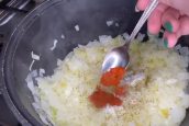 Vepřové maso nakrájejte na kostky a cibuli na malé kostičky. Do hrnce dejte trochu oleje a nechte na něm smažit cibuli, dokud nezesklovatí a nezměkne. Pak přidejte sůl, pepř, sladkou papriku a případně další koření vhodné k vepřovému masu. Jeho množství záleží hlavně na vaší chuti.