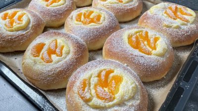 Vyložte plech pečicím papírem a potřete ho zlehka olejem. Pak na něj různě cik cak dejte hnědé těsto a na něj poté opatrně rozetřete světlé těsto. Zarovnejte ho stěrkou a vložte plech do předehřáté trouby na 180 °C péct na zhruba 10 minut. Po dopečení těsto dejte na vlhkou utěrku, srolujte a nechte vystydnout.