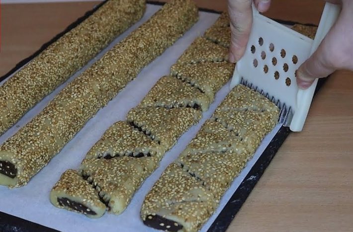 Nasypejte na sáček trochu sezamu a váleček těsta v něm obalte. Pak ho rukou zploštěte, rozkrájejte ho na trojúhelníky a dejte je na plech vyložený pečicím papírem. Vložte ho do předehřáté trouby na 175 °C a pečte sušenky 25 minut.