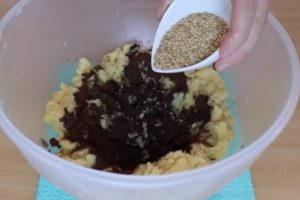 Dejte do mísy změklý margarín a rozmíchejte ho s cukrem na pastu. Pak přilijte olej a promíchejte, nakonec přidejte žloutek a sůl a opět promíchejte. Smíchejte mouku s práškem do pečiva, polovinu dejte do mísy, promíchejte, přidejte druhou polovinu a rukama vypracujte hutné, hladké těsto. Rozdělte ho na 2 části, do jedné přidejte sezam, kakao a mléko a důkladně ho prohněťte, aby se suroviny dobře propojily. Zabalte těsta do fólie a dejte minimálně na hodinu do lednice.