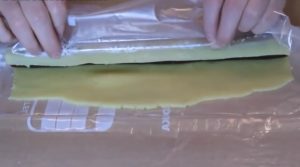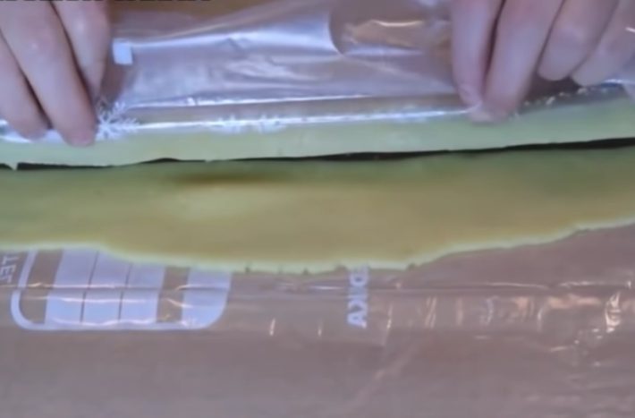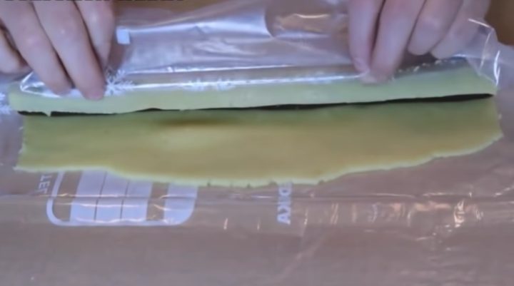 Tmavé těsto rozdělte na 4 díly a udělejte z každého váleček. Světlé rozdělte na 4 díly, vytvarujte z něj váleček, trochu ho zploštěte a pak vložte mezi dva igelitové sáčky. Poté z něj vyválejte placku ve tvaru dlouhého obdélníku. Těsto z pytlíků oddělte a nechte ho na jednom ležet. Položte na jeho kraj tmavý váleček, okraje zarovnejte kolečkem na pizzu a pomocí sáčků vše srolujte.