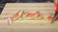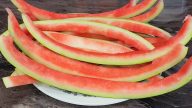Z melounu oloupejte tmavě zelenou slupku a světle zelenou část, která zbyde, nakrájejte na menší kousky. Ty smíchejte s vodou, jedlou sodou a nechte je 1 hodinu odpočívat.