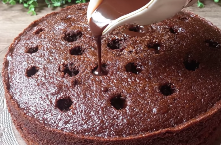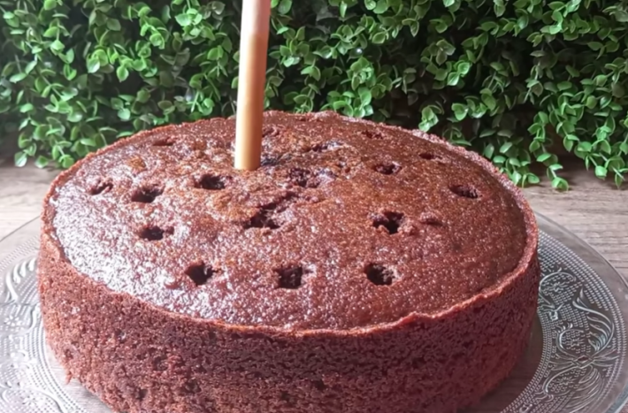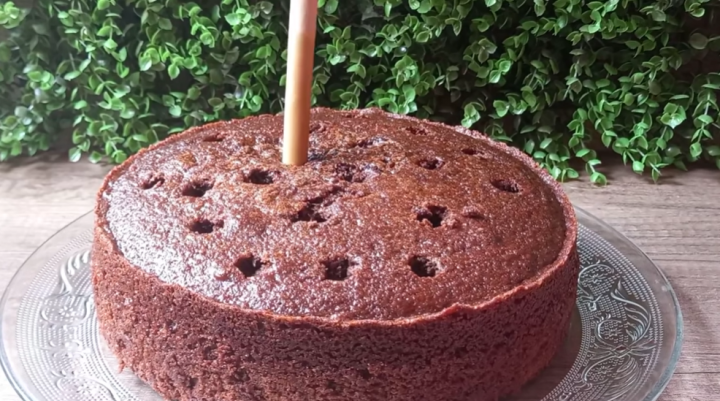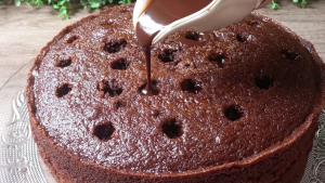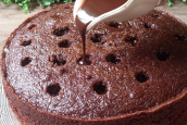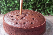 Dortovou formu vymažte olejem a nalijte do ní připravené těsto. Pečte buď 40 minut při 180 °C, nebo 2,5 hodiny při 120 °C. Pokud zvolíte pomalejší postup, bude mít dort krásně rovný povrch, jinak se může trochu vyboulit. Upečené těsto nechte trochu vychladnout a vyjměte ho z dortové formy. Vezměte vařečku a rukojetí prohlubte do povrchu několik děr. Snažte se přitom neprorazit dno.