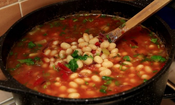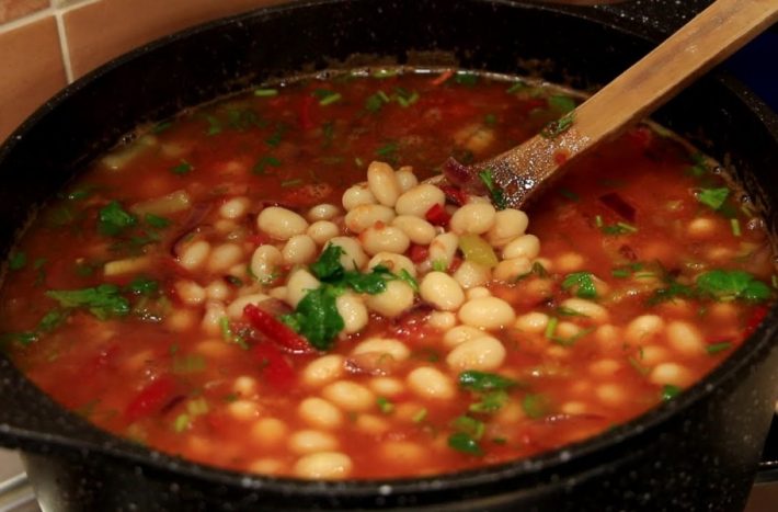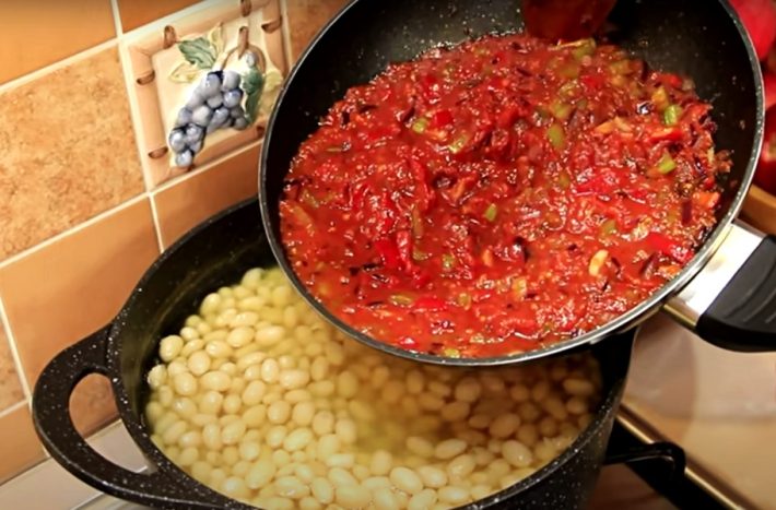 Když jsou fazole v hrnci měkké, vyklopte k nim směs restované zeleniny z pánve a důkladně je rozmíchejte. Podle chuti přidejte sůl a mletý černý pepř a nadrobno nasekané zelené bylinky. Promíchejte, nechte 5 minut provařit a podávejte.