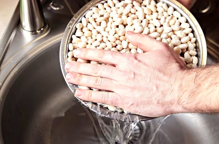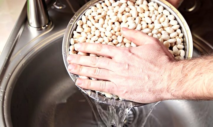 Bílé fazole zalijte vodou a nechte je do druhého dne nabobtnat. Poté je propláchněte a slijte z nich veškerou vodu. Fazole přesypejte do hrnce, zalijte je vroucí vodou a nechte je 30 až 40 minut stát. To opakujte dvakrát nebo třikrát, poté je dobře propláchněte, zalijte je novou studenou vodou a dejte je vařit na sporák, kde by měly strávit okolo 40 až 45 minut. Když jsou fazole téměř měkké, přidejte k nim asi 1 lžičku soli.