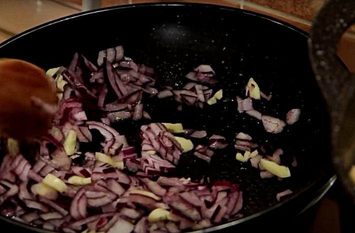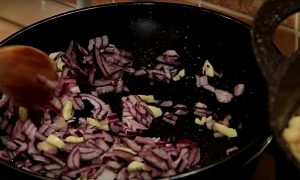 Oloupejte červenou cibuli (můžete použít i bílou, ale červená vytváří krásný barevný efekt) a nakrájejte ji na drobné kostičky. Nadrobno nakrájejte také dva stroužky česneku. V pánvi rozehřejte trochu rostlinného oleje, vsypte do něj připravenou cibuli i česnek a obojí na středním žáru smažte 2 nebo 3 minuty.