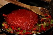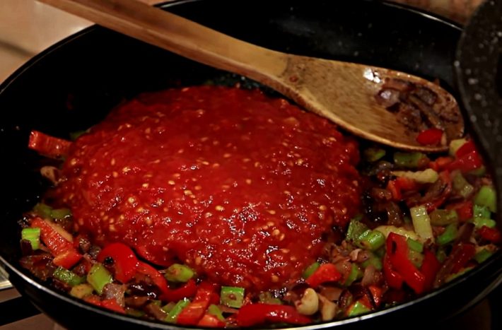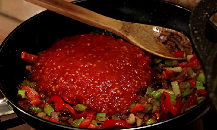 Promíchejte a přidejte sůl, sladkou papriku, chilli a mletý koriandr. Po další chvilce přijdou do směsi rajčata, která jste předtím oloupali a nastrouhali na jemném struhadle. Můžete také použít loupaná rajčata z konzervy. Promíchejte a přidejte i rajčatový protlak, který nechte 3 až 4 minuty zasmažit. Přitom můžete trochu zvýšit plamen.