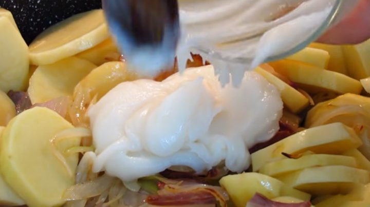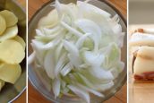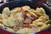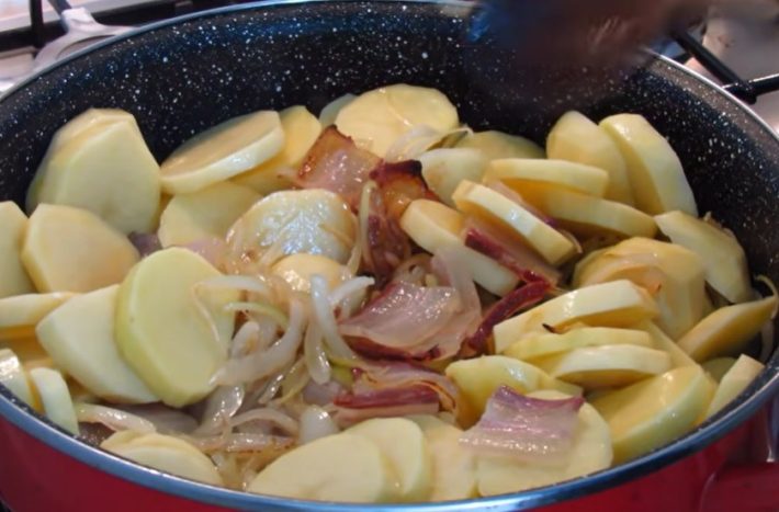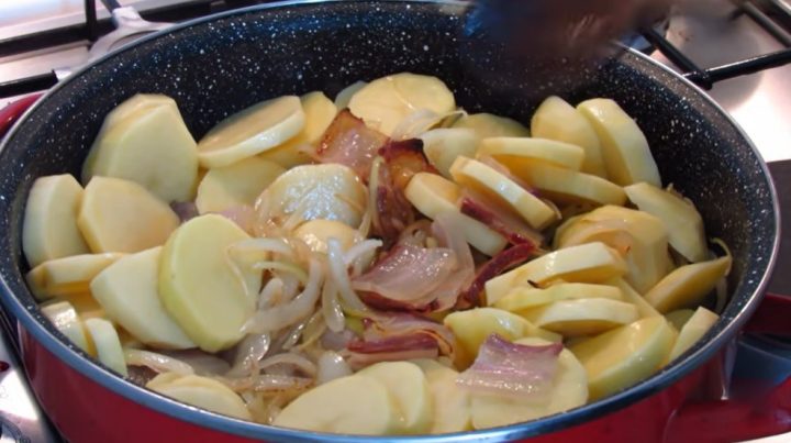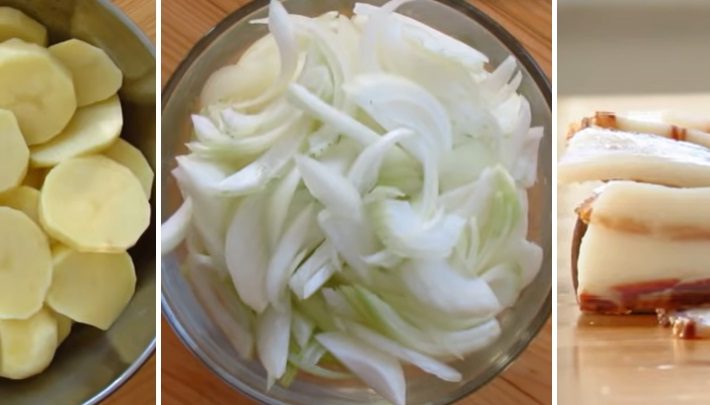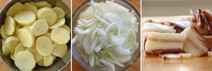 Brambory umyjte pod tekoucí vodou a oloupejte z nich slupku. Když jsou oloupané, nechte je chvilku ponořené ve studené vodě, aby se vyplavil škrob. Vodu poté slijte a brambory nakrájejte na kolečka o síle kolem půl centimetru. Oloupejte cibuli, rozkrojte ji na poloviny a ty nasekejte na jemné proužky. Slaninu nakrájejte na plátky.