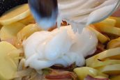 Během restování přidejte do pánve čtyři polévkové lžíce domácího vepřového sádla, které rozmíchejte, aby se jím všechny brambory obalily. V průběhu restování posypejte brambory solí, mletým pepřem a znovu dobře promíchejte, aby se všechno koření dostalo ke všem plátkům brambor.