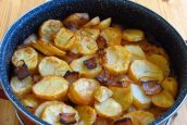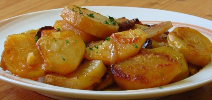 Když jsou brambory opečené, zastavte oheň, přidejte do pánve lžičku sladké mleté papriky, promíchejte a vše zalijte 250 mililitry vody. Velmi dobře promíchejte, zakryjte hrnec alobalem a vložte do trouby vyhřáté na 200 °C péct 30 minut. Poté brambory odkryjte, zvyšte teplotu na 250 °C a dopékejte dalších 15 minut, dokud jejich povrch nezezlátne. Pak už jsou brambory hotové a můžete je podávat.