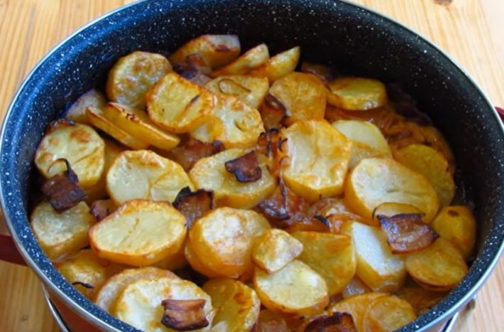 Na kamnech rozehřejte hlubokou pánev s kovovými úchyty či hrnec a nalijte do něj dvě polévkové lžíce rostlinného oleje. Když je horká, vhoďte na ni cibuli a osmažte ji dozlatova. Poté na pánev přidejte také plátky slaniny a restujte, dokud neucítíte slastnou vůni a slanina nezprůhlední. V tu chvíli přidejte do pánve pokrájené brambory, zmírněte plamen na pomezí mírné a střední teploty a pokračujte v restování. Čas od času vše promíchejte, aby se rovnoměrně opekly všechny brambory z obou stran.