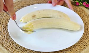 Oloupejte velmi zralé banány, které mohou být klidně i tmavší. Čím tmavší barvu budou mít, tím budou sladší. Rozmačkejte je vidličkou, přidejte k nim dvě vejce a špetku soli a směs rozšlehejte dohladka. Zapracujte kakao a prášek do pečiva a vytvořte jemné a polotekuté těsto. K banánové směsi přidejte nabobtnalé vločky i se zbylým mlékem z misky a vše promíchejte do homogenního těsta.