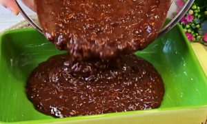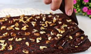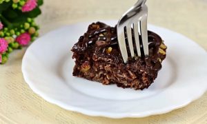 Když čokoláda zaschne, nakrájejte buchtu na čtvercové porce a podávejte se šálkem voňavého čaje nebo kávy.