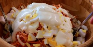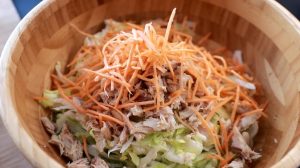Dejte vařit vejce do osolené vody a vařte 8 minut od bodu varu. Mezitím nakrájejte salát na proužky a dejte ho do mísy. Přidejte k němu tuňáka (případně makrelu), kterého jste předtím natrhali vidličkou na menší kousky. Poté přidejte nastrouhanou mrkev.