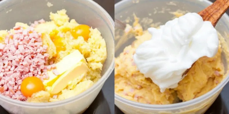 Nejprve si brambory oloupejte a uvařte je v mírně osolené vodě do měkka. Následně je sceďte a vytvořte z nich jemné pyré. Do něj vsypte jemně pokrájenou šunku, změklé máslo, vaječné žloutky a ochuťte solí, mletým pepřem a muškátovým oříškem. Směs promíchejte vařečkou, abyste důkladně propojili všechny suroviny.