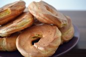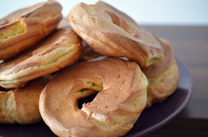 Vznikne kompaktní těsto. Nechte jej asi dvě minuty odpočinout a jemně míchejte za pomoci vařečky. Metličkou už by tužší směs míchat nešla. Poté přidávejte postupně prošlehaná vejce, která zapracovávejte do těsta lžíci po lžíci. Těsto přesuňte do plnicího sáčku, vytvořte na pečicí papír kroužky (jako předlohu můžete použít obkreslené kolo požadované velikosti). Nyní můžete podle původního receptu pomazat žloutkem a posypat mandlovými lupínky. Dejte péct na 35–40 minut, poté snižte teplotu na 140 °C a pečte dalších 15 minut.