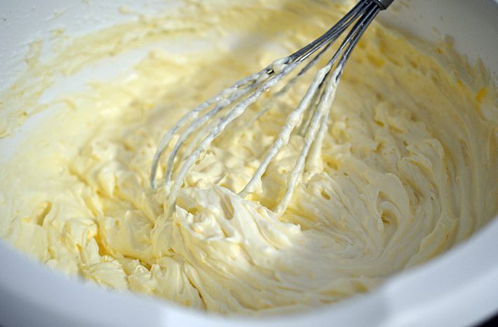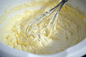 Mezitím si připravte vanilkový krém. Do hrnce vyklepněte žloutky, přidejte škrob, cukr a začněte jemně míchat. Po lžících přilévejte mléko a míchejte, aby nevznikly hrudky. Hrnec dejte na plotýnku na střední plamen a po celou dobu míchejte, dokud krém nezhoustne na požadovanou konzistenci. Poté sundejte z plotýnky a zapracujte do krému máslo. Přikryjte potravinovou folií a dejte stranou, aby mohl krém vychladnout.