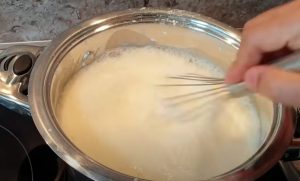 Do rendlíku dejte žloutky, cukr, vanilkový cukr a kukuřičný škrob. Promíchejte, nalijte trochu mléka a míchejte, dokud se vše nerozpustí. Poté dolijte mléko. Rendlík postavte na kamna a dejte směs vařit na mírném plameni za stálého míchání, dokud směs nezhoustne. Krém pak dejte do mísy a nechte vychladnout.