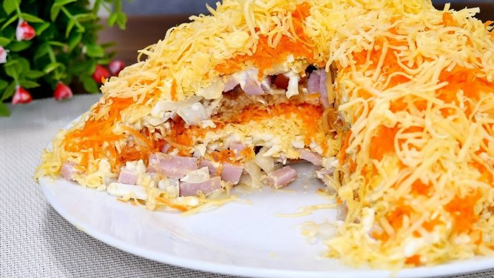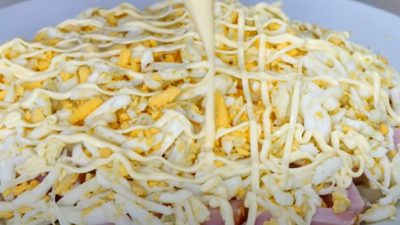 Najemno nastrouhejte také sýr a začněte s vrstvením. Cibuli slijte a rozprostřete ji na servírovací talíř. Pokryjte ji uzeným masem, na které aplikujte vrstvu majonézy.
