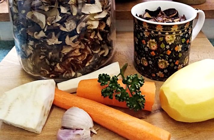 Hrnek sušených hub dejte předem namočit do misky se studenou vodou. Kořenovou zeleninu očistěte a nakrájejte na drobné kostičky. Oloupejte cibuli a česnek a obojí nasekejte nadrobno. V hrnci rozehřejte trochu másla a cibuli s česnekem na ní orestujte dorůžova. Přihoďte pokrájenou kořenovou zeleninu, posypejte kmínem a chvilku společně restujte.
