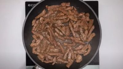 Na lžíci rozpuštěného sádla zprudka smažte hovězí maso 4–6 minut, dokud se nezatáhne. V samostatném hrnci smažte na zbytku sádla nadrobno nakrájenou cibuli 2–3 minuty, a jakmile zhnědne, přidejte hořčici.