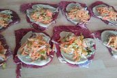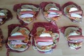 Na hromádku zeleniny položte plátek slaniny, čtvrtku natvrdo uvařeného vajíčka a půlku malého párku. Maso stočte do pevného balíčku a zavažte ho potravinářskou nití.