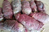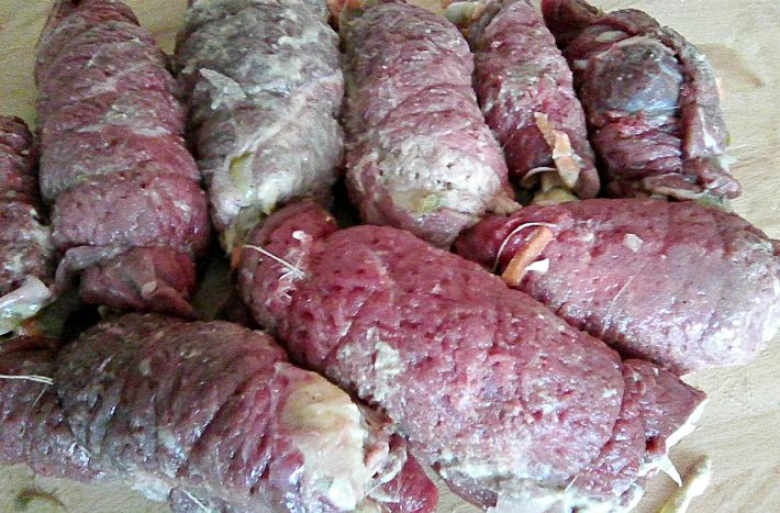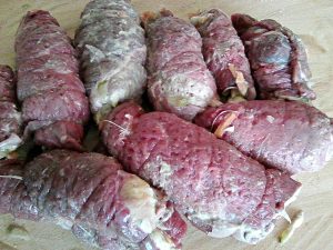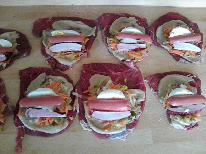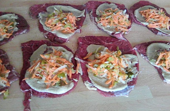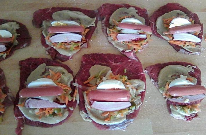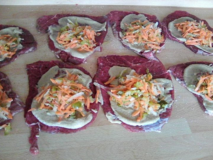 Cibuli, okurku a mrkev nastrouhejte nahrubo. Hovězí plátky rozklepejte a z obou stran je podle chuti osolte a opepřete. Maso rozložte vedle sebe, svrchu potřete hořčicí a na každý plátek položte trochu cibule, mrkve a okurky.