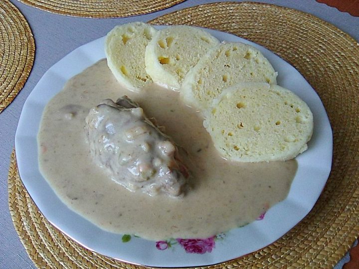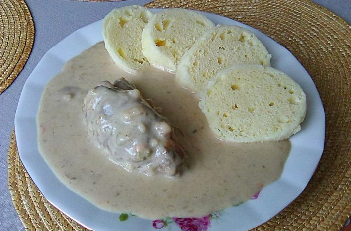 Vedle v misce si vytvořte záklechtku z trochy hladké mouky a vody a nalijte ji do hrnce s masem a zeleninou, kterou předtím zalijte plnotučnou smetanou. Vše rozmíchejte dohladka, chvíli provařte a podle chuti dosolte a dopepřete. Podávejte s domácím houskovým knedlíkem.
