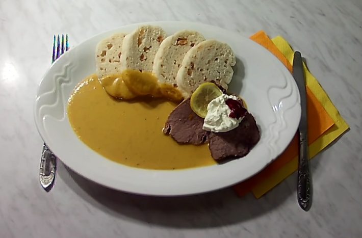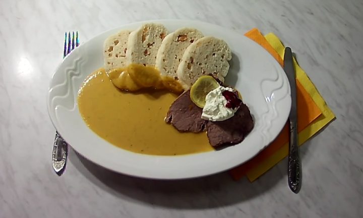 Hovězí maso nakrájejte na slabé plátky. Na talíři jej podlijte omáčkou a ozdobte plátkem citrónu, kopečkem šlehačky a lžičkou brusinek. Přidejte houskové knedlíky a podávejte.