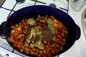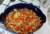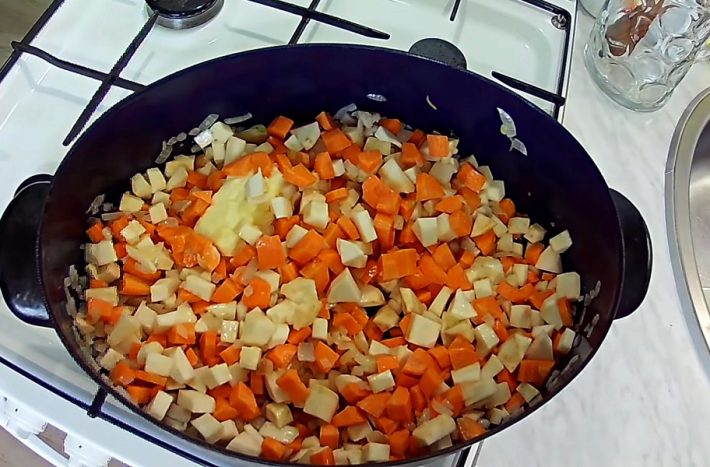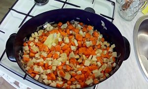 Maso osolte a opepřete a koření vmasírujte do masa. Cibuli spolu s kostičkami slaniny nechte v žáruvzdorném hrnci nebo v pekáči zesklovatět na troše sádla nebo rostlinného oleje. K cibuli přidejte půl kostky másla a poté veškerou kořenovou zeleninu. Vše za častého míchání restujte, dokud se všechna zelenina neosmahne dozlatova.