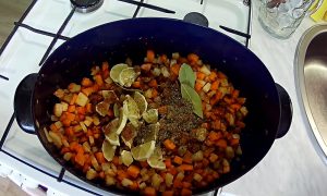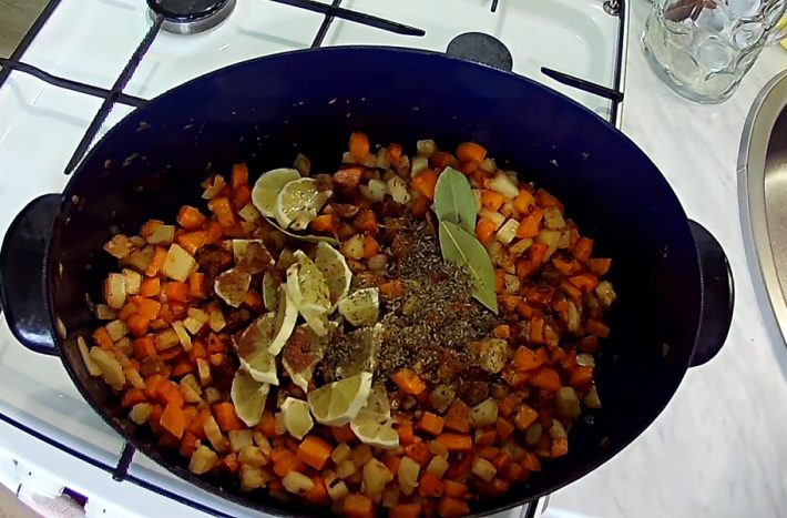 Do zeleninového základu přidejte bobkové listy, celý černý pepř a nové koření a na půlkolečka nakrájený citrón. Do hrsti si vsypte tymián a rozmělněte ho mezi dlaněmi. Poté ho pošlete do zeleninové pánve spolu s jednou lžičkou mletého muškátového oříšku. Promíchejte a ještě chvíli nechte vše společně zasmažit.