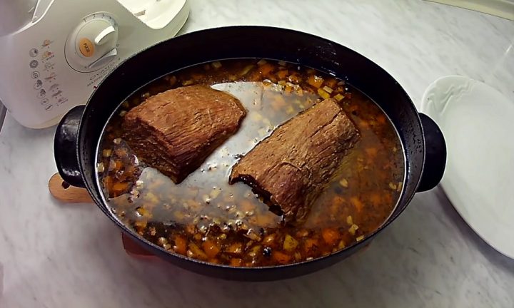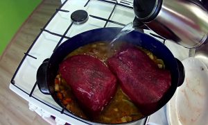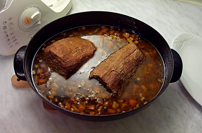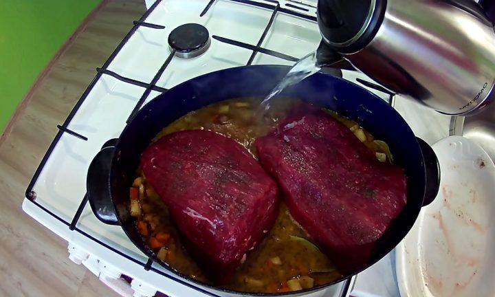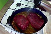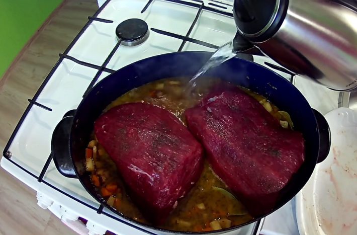 Obsah pánve podlijte vroucí vodou tak, aby byla zelenina tak akorát ponořená. Do vroucí vody v pánvi položte připravené maso a přilijte vodu tak, aby dosahovala asi do dvou třetin výšky masa. Pánev přiklopte poklicí a vložte ji do trouby rozehřáté na teplotu 200 °C péct po dobu 1,5 až 2 hodin.