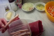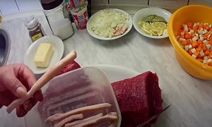 Cibuli a kořenovou zeleninu nakrájejte nadrobno. Citrón oloupejte a nakrájejte ho na kolečka. Slaninu nakrájejte na tenčí a dlouhé proužky, které nechte zamrazit, aby se s nimi lépe pracovalo. Mělo by vám vyjít asi 6 proužků. Zbylou slaninu nakrájejte na drobné kostičky, které nechte nezmrazené.