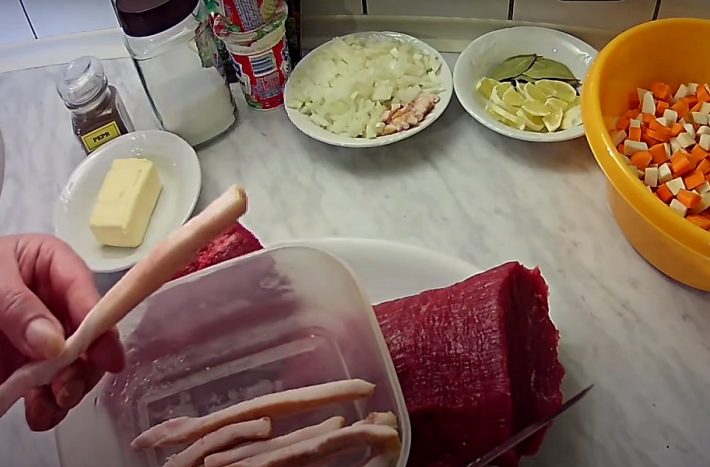 Do masa vytvořte dlouhým a ostrým nožem podélné zářezy, do nichž nastrkejte zmrazené proužky slaniny. Pokud je třeba, maso rozřízněte tak, aby se vám vešlo do hrnce. Do každé poloviny nastrkejte 2 nebo 3 proužky slaniny.