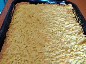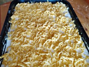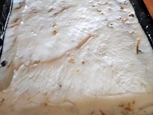 Odložené bílky smíchejte s jednou lžící cukru a vše vyšlehejte do pevného sněhu, který rozetřete na jablečnou vrstvu v plechu. Vyndejte těsto z mrazáku, rozbalte ho a na hrubém struhadle ho nastrouhejte přímo na povrch koláče a případně ho rovnoměrně rozprostřete.
