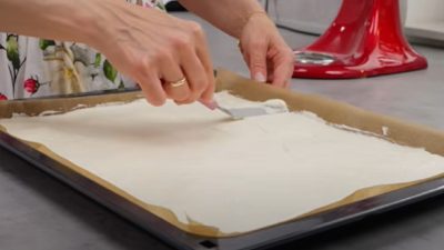 Zakysanou smetanu vyšlehejte s moučkovým cukrem, ztužovačem šlehačky v prášku a smetanou ke šlehání. Krémem následně potřete těsto, které předem rozbalte.