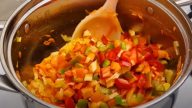 Po této době přidejte nakrájenou papriku, ingredience zamíchejte a smažte je 2 minuty, pod pokličkou.